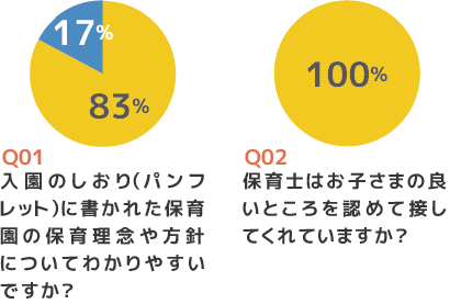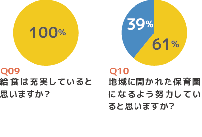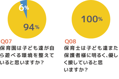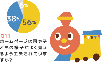 またQ6 •Q11 の項目に対しましては、園としてできる限りの対応はしているつもりではありますが、皆様の具体的なご意見をいただけるよう工夫したアンケートを用意し、今後の保育園の向上に役立たせて頂きたいと思っています。